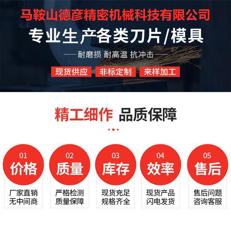 馬鞍山德彥精密機(jī)械科技有限公司是專(zhuān)業(yè)生產(chǎn)研發(fā)各類(lèi)機(jī)械刀片和工業(yè)模具的中型制造企業(yè)。我公司生產(chǎn)的產(chǎn)品適用于冶金、包裝、印刷、造紙、紙箱、橡膠、紡織、食品等行業(yè),規(guī)格多樣,品種齊全。我公司嚴(yán)格按照ISO9001:2000國(guó)際質(zhì)量體系組織標(biāo)準(zhǔn),擁有先進(jìn)的生產(chǎn)設(shè)備和雄厚的技術(shù)力量。我公司一直以“生產(chǎn)優(yōu)質(zhì)產(chǎn)品... 查看更多